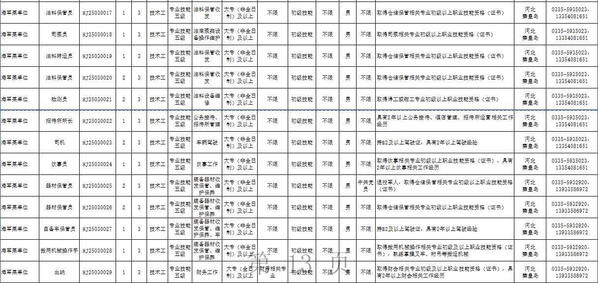 海军相关单位从事装备维修、物资器材存储、后勤保障、文化服务等工作的专业技能岗位。具体招考岗位计划见附件。