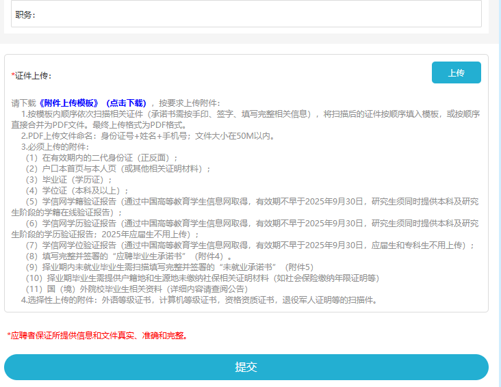 应聘者需在线上传教育部学籍在线验证报告,并上传二代身份证、户口薄(或其他相关证明材料)、毕业证、学位证、应聘毕业生承诺书(附件4)、未就业承诺书(附件5)扫描件。学籍验证报告(通过中国高等教育学生信息网取得)须在有效期内。