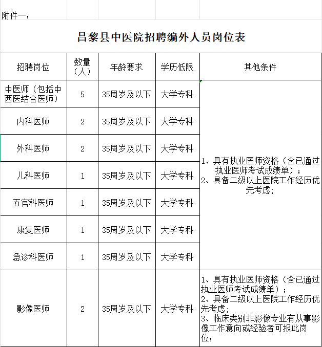 具体招聘岗位、人数、学历要求、专业条件及其他要求详见《昌黎县中医院公开招聘编外人员岗位表》(附件1)。