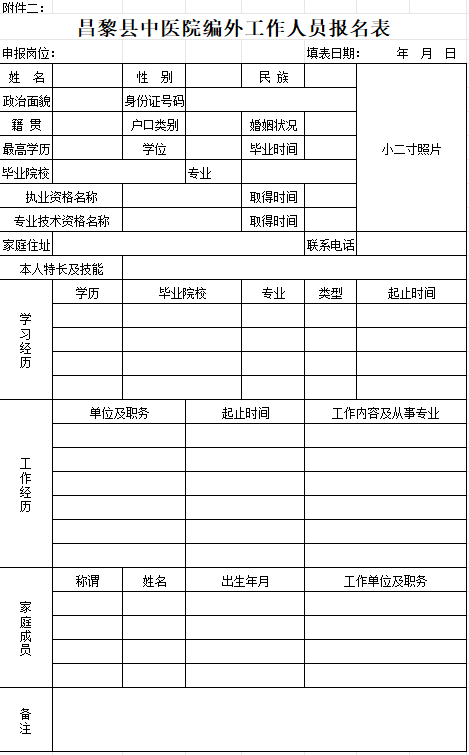 填写完整的《昌黎县中医院公开招聘编外人员报名表》(附件2)。
