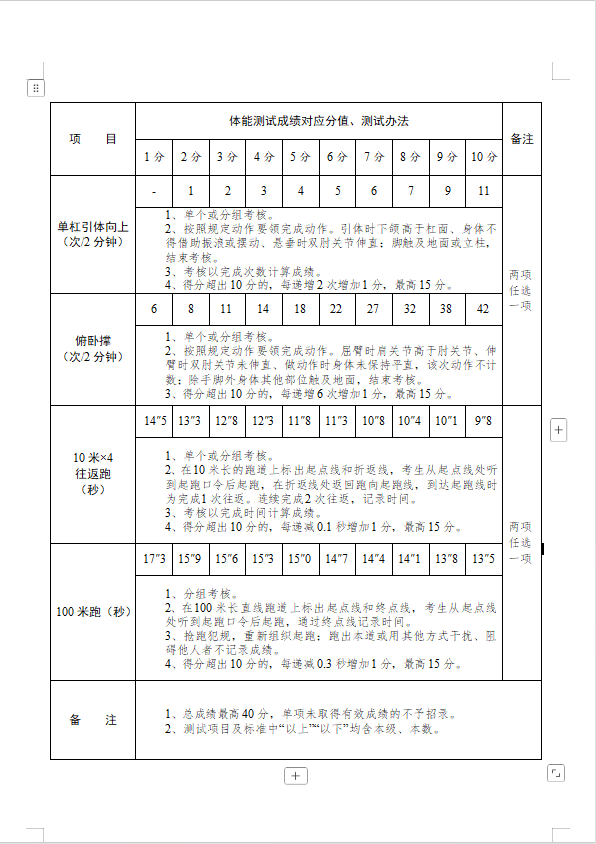 (二)体能测试。体能测试为1000米跑(必考),原地跳高和立定跳远(两项任选一项),单杠引体向上和俯卧撑(两项任选一项),10米×4折返跑和100米跑(两项任选一项),具体考核标准见附件。报考人员需在现场报名时确认考试科目并签字。最终根据考核成绩,确定参加面试人员。
