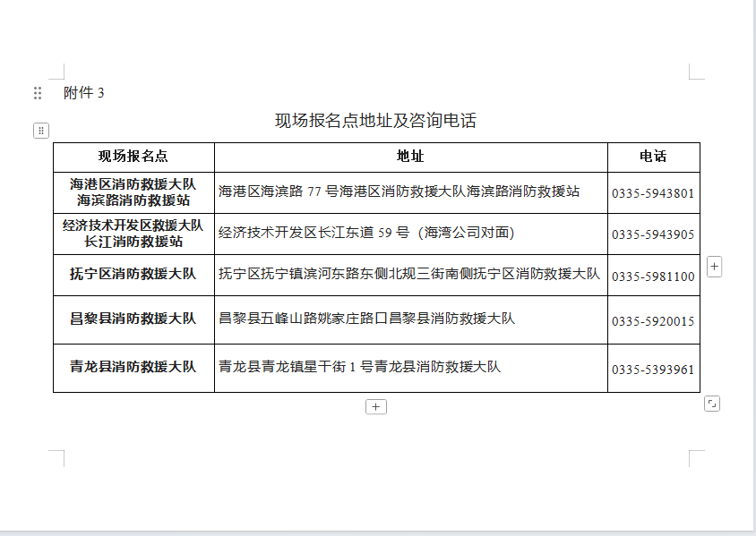 报名人员可就近到分报名点报名:海港区消防救援大队海滨路消防站、经济技术开发区消防救援大队长江道消防站、抚宁区消防救援大队、昌黎县消防救援大队、青龙县消防救援大队,具体地址附后。报名时请注意办公秩序。