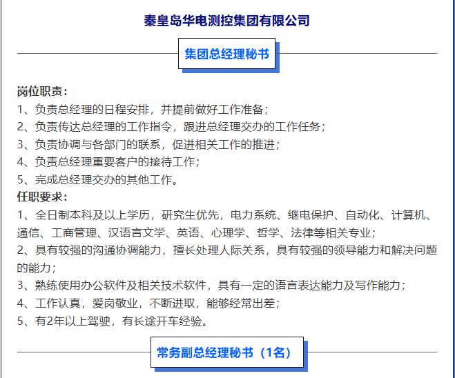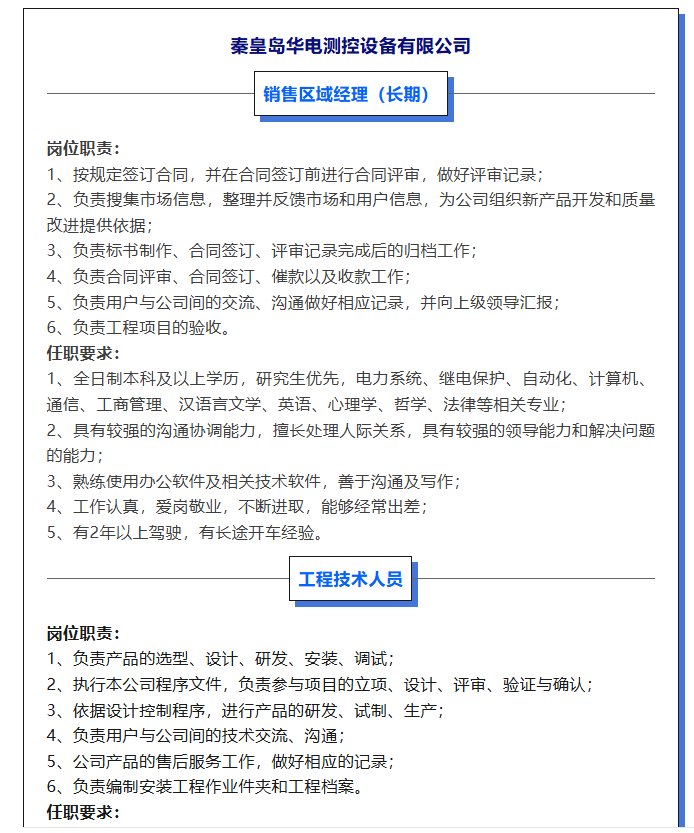 秦皇岛华电测控设备有限公司成立于1999年2月,是一家集科、工、贸、文为一体的高新技术企业。经过26年的开拓进取、发展壮大,现已成为拥有7家子公司的华电测控集团。集团公司业务覆盖:火力发电厂测量和自动控制系统、工业自动化系统改造及方案设计、虚拟电厂、智慧供热服务 、售电服务、美国R-Levels工业清洗剂及服务、大健康产业(乐享营、智能穿戴、远红外系列产品)档案管理、人力资源管理咨询、企业内训、企业管理咨询等。公司先后获得“河北省对标示范企业”、“河北省科技型中小企业”、“省级制造业单项冠军”、“国家知识产权优势企业”、“河北省专精特新企业”等荣誉称号。一直以来,华电测控都致力于新质生产力的培养和建设,潜心研究行业发展的新技术、新方法、新趋势,促进生产力高科技、高效能、高质量发展。集团先后获得了67项自主创新知识产权,参与起草了11项行业标准及团体标准,产品覆盖全国各省市(除港澳台及西藏自治区),并远销美国、澳大利亚等十余个国家,取得了良好的业绩,获得了上百项荣誉,受到了广泛好评。目前,我国经济社会发展进入新时代,华电测控集团同时迎来重大转型升级期。我们在智慧供热和售电的基础上,开辟出新的战场,积极践行“双碳”,推广电能替代,着力于智慧供热和虚拟电厂建设,创建城市“双碳”服务平台。急需优秀人才加入,共创辉煌事业,共享灿烂人生!